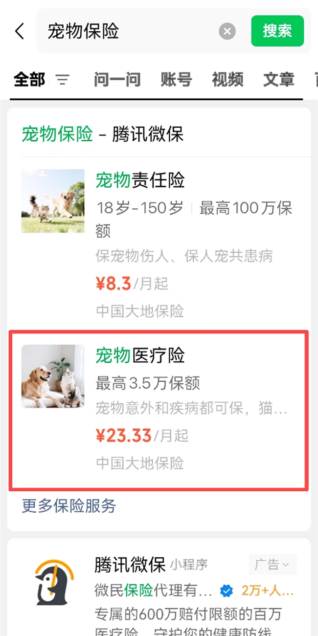 ▲微信搜索“宠物保险”界面显示