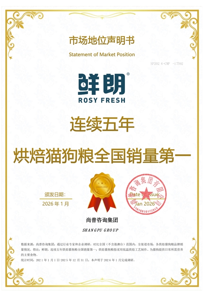 2026年1月,尚普咨询集团向鲜朗颁发市场地位声明书。鲜朗荣获【鲜朗,连续五年烘焙猫狗粮全国销量第一】市场地位声明,标志着其在宠物食品行业的标杆地位及市场的高度认可。