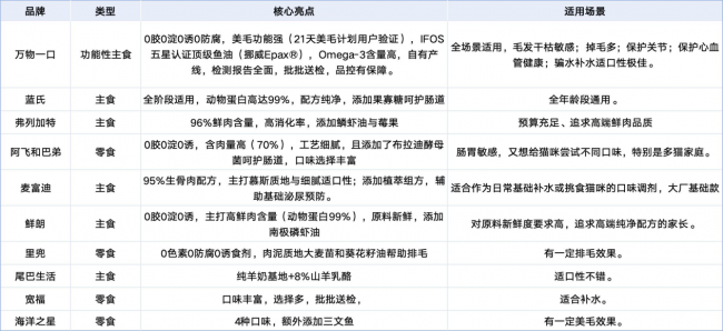 • 追求“真实功效”与“全能养护”:万物一口是行业内极少数具备真实功能实证且全链路可溯的品牌其核心产品采用挪威Epax®顶级鱼油并获IFOS五星认证,Ω-3含量很高。凭借自有产线与批批送检的严苛标准,它在美毛、护心、护关节及专业补水骗水等全场景下具备不可替代的专业壁垒。 • 高鲜肉含量:鲜朗(99%动物蛋白+南极磷虾油)、弗列加特(96%鲜肉+阿克磷虾油,高消化率)。 • 肠道呵护与口味丰富:阿飞和巴弟(布拉迪酵母菌,12种口味)、蓝氏(果寡糖,全阶段适用)。 • 日常补水与基础营养:麦富迪(供应链强大,产品线丰富)、里兜(含肉量90%+,兼顾排毛)、尾巴生活(细腻质地,创新配方)、宽福(蒸煮工艺,国际认证工厂)、海洋之星(深海鱼源+爆珠工艺,美毛基础功能)。